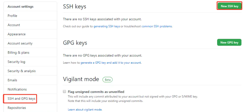 接着打开github主页,点击个人设置,点击左侧的SSH and GPG keys,点击New SSH key